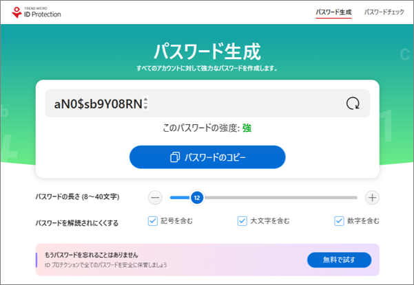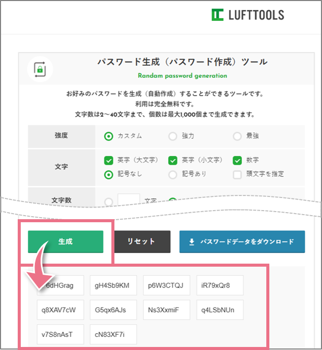 パスワードの強度や使用する文字の種類を選び、「生成」をクリックするだけで指定の数のパスワードが作られます。「パスワードデータをダウンロード」をクリックすると、作られたパスワードの一覧を保存することもできます。