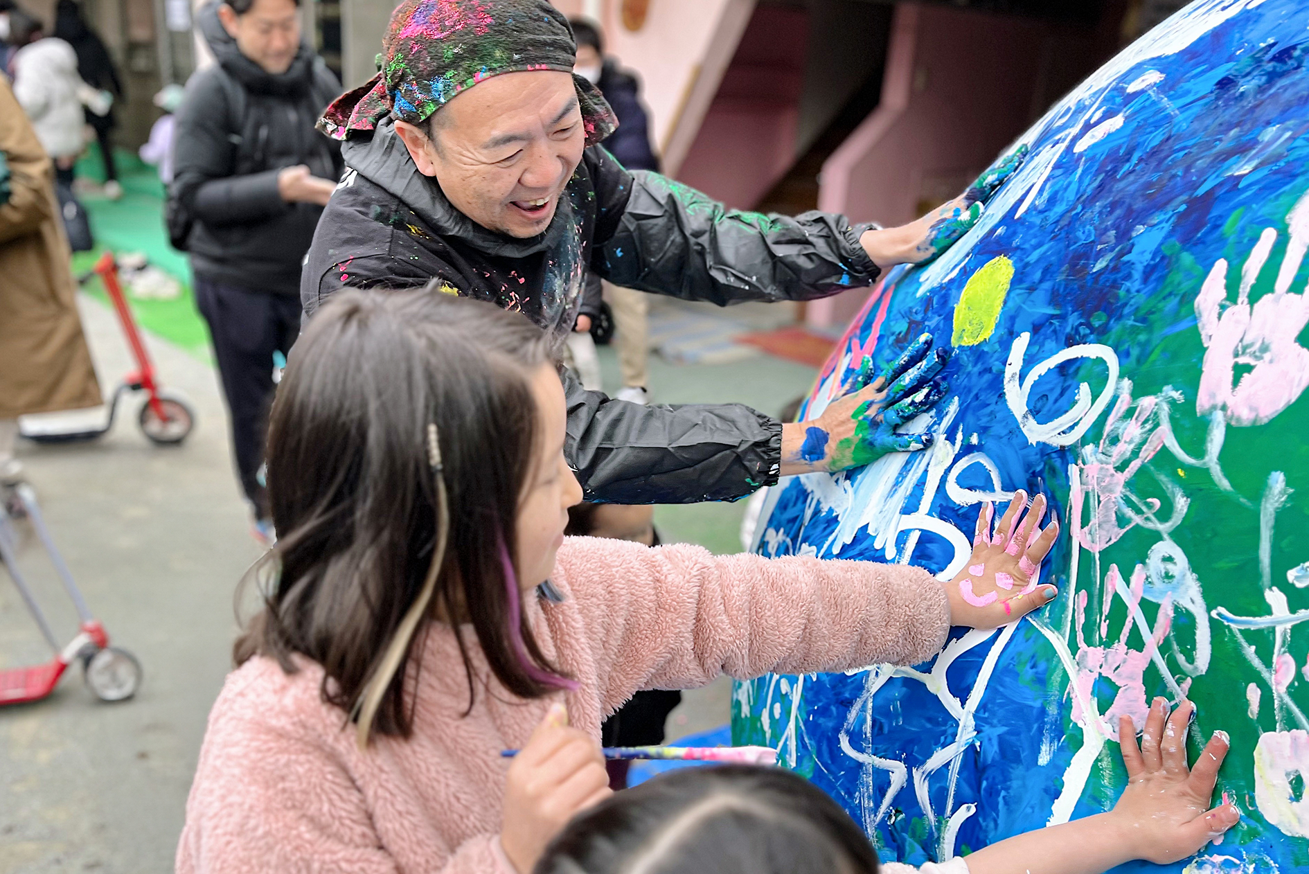 同園に集う大人は、地域のステークホルダーや自らの“好き”を究めるプロフェッショナル。園庭開放ではプレイワーカーの協力のもと、廃材を活用した秘密基地をつくったり、奥多摩産材のカンナくずプールや丸太を小さく加工したカスタネット「丸太ネット」をつくって演奏したり、万博パビリオン風にバルーンに絵本作家が巨大な地球を描き、子どもたちと未来に持っていきたいものを描いたりと、子どものわくわくを引き出す工夫が光ります。
