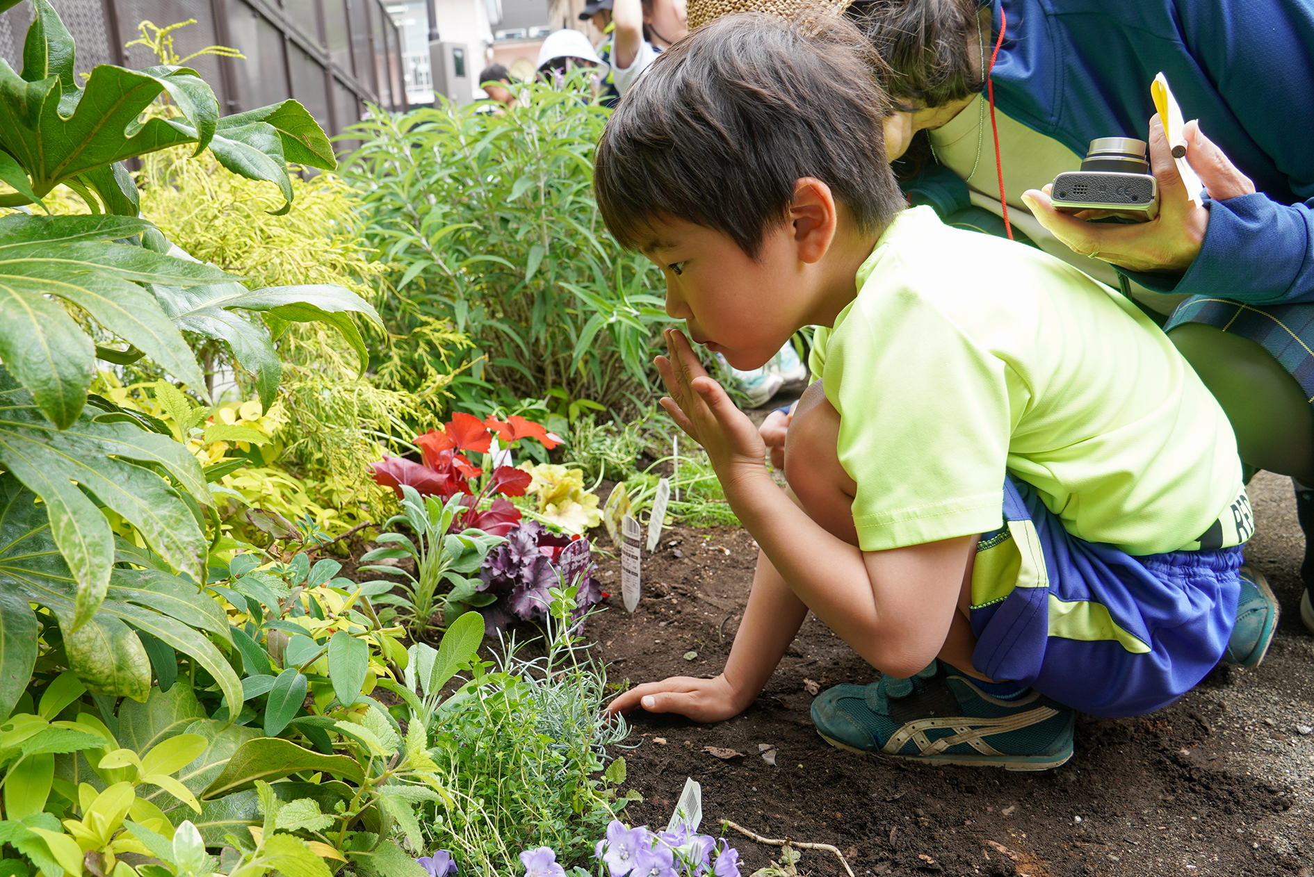 「葉からカレーの匂いがするよ。触って嗅いでごらん?」「アゲハ蝶はレモンの木が大好き。葉の裏に卵を産み付けるんだよ」。ガーデナーの半田淳さんの声かけに子どもたちは目の前の草花や生き物に夢中です。