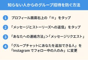Instagramには、誰でも他人をグループチャットに招待できるしくみがあります。こうしたグループ招待は、悪質な広告やアカウントの乗っ取り、フィッシング詐欺の入り口になっている可能性があり、注意が必要です。