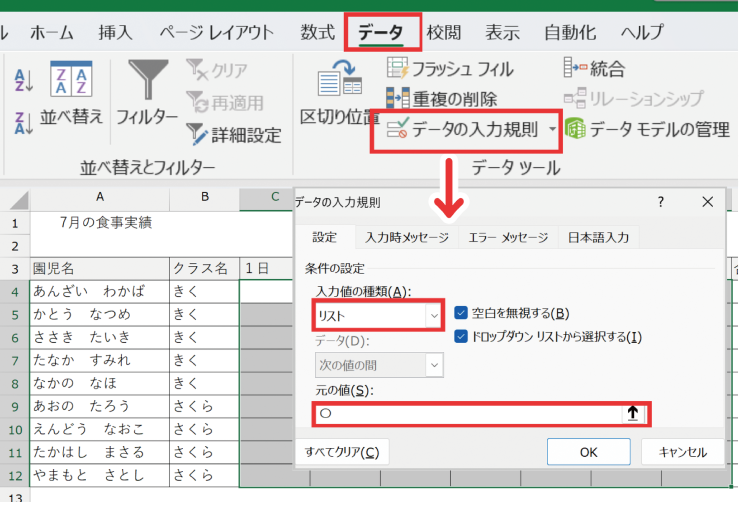 ドロップダウンリストを設定したいセルをすべて選び、[データ-データの入力規則]から[設定-入力値の種類] を[リスト]にします。元の値に「〇」と入力し[OK]をクリックします。入力項目を複数から選べるようにしたい場合はカンマで区切りましょう。