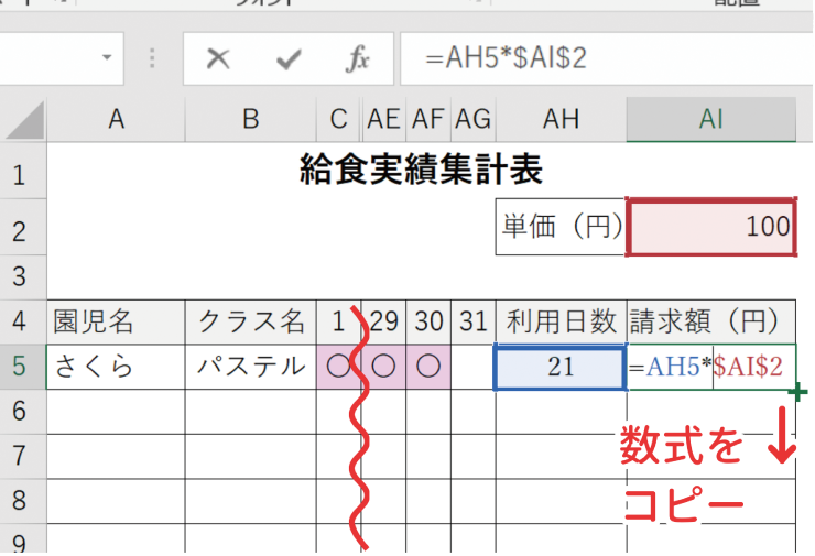 COUNTIF 関数(=COUNTIF(範囲,検索条件))で利用日数(〇の数)をカウント。図ではAH5に「=COUNTIF (C5:AG5,”〇”)」、請求額のセルには「=AH5*$AI$2」と入力。単価のセルに$をつけると参照元を固定でき、単価を他に移動しても式は崩れません。