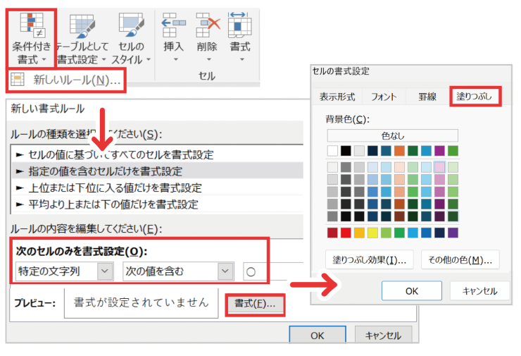 [ホーム-条件付き書式]で[新しいルール]を選択。ルールの種類を[指定の値を含むセルだけを書式設定]、内容を[特定の文字列-次の値を含む]に変更し「〇」と入力。[書式]で塗りつぶしの色を選んで設定完了です。