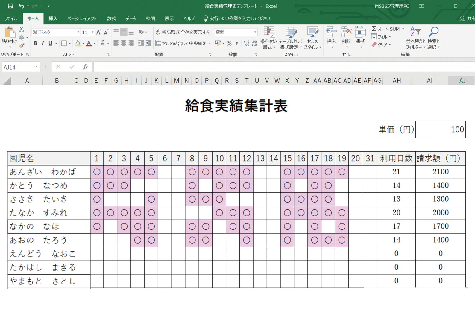 まずは、園児ごとの利用実績表を作成しましょう。縦(列)に「園児名」、横(行)に「日付」「利用日数」「請求額」を入力します。