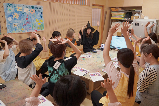 ハロウィンが近づく10月初旬、園内の一室に10人程の職員が集まり、英語のジェスチャーゲームに挑戦していました。職員は月に1回、英語の発音やリズムに加え、保育にも取り入れられる英語のゲームや歌を学んでいます。