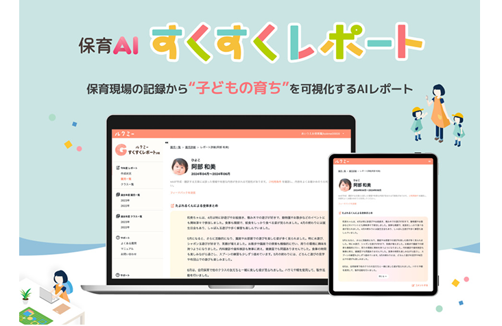 すくすくレポートは、過去に保育者が記録した写真や日誌から、子どもの成長を保育AI機能で自動的にレポートにまとめてくれる機能です。保育者が過去をさかのぼって子どもたち一人ひとりの写真を探し整理する手間が省けることに加え、クラスや子どもについての成長の振り返りが手軽にできます。