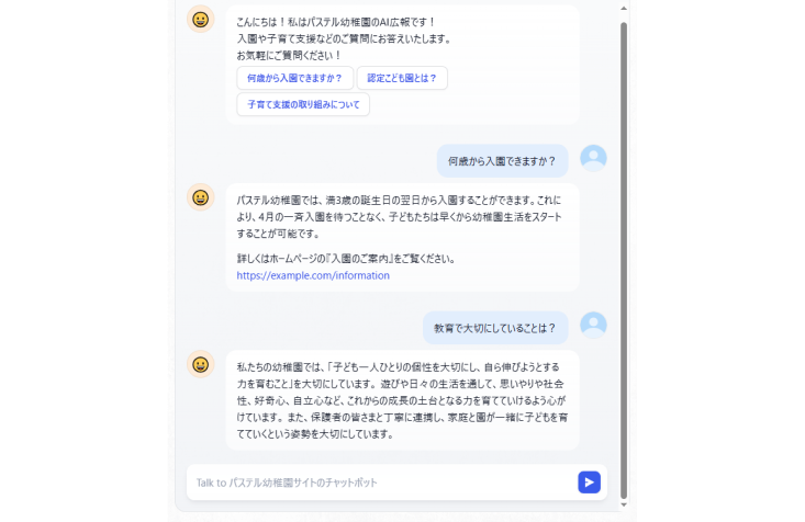 AI広報は、保護者や園ホームページの利用者からの質問に、AIがチャット形式で自動応答する機能です。「何歳から入園できますか?」「教育で大切にしていることは?」といった質問に即時回答が可能。問い合わせに24時間365日対応しながら、職員の負担軽減にもつながるしくみを目指しています。