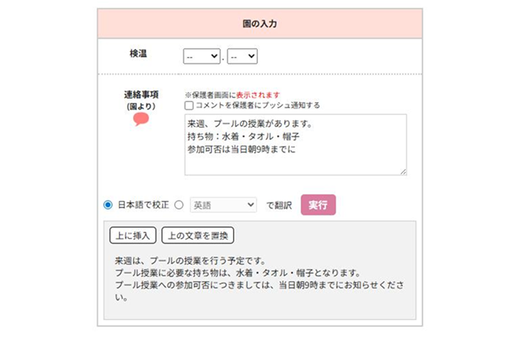 パステルAppsは、園業務をサポートする保育ICTシステム。出欠連絡、登降園管理、預かり・延長保育など、園業務に必要な機能を搭載しています。保護者とよりスムーズなコミュニケーションが取れるよう、AIによる文章校正や外国語翻訳ができる機能を現在開発中。今後の実装にご期待ください。