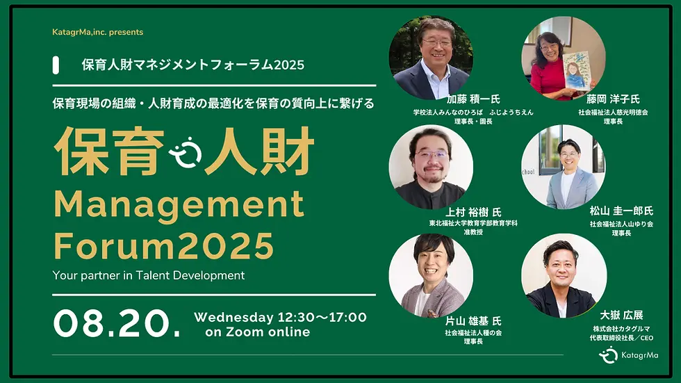 保育・教育・療育事業者向けの経営支援を行う株式会社カタグルマ(本社:東京都千代田区、代表取締役:大嶽広展)は、2025年8月20日(水)に、オンラインセミナー『保育人財マネジメントフォーラム2025』を開催いたします。