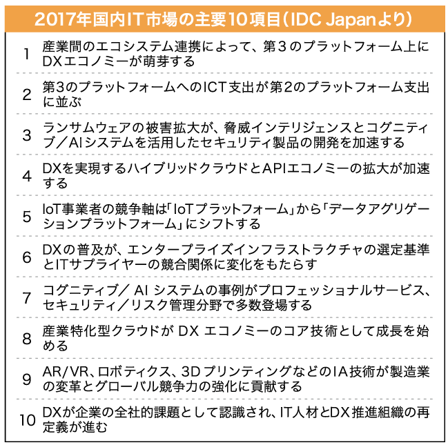 2016年12月13日、IT専門調査会社であるIDC Japan(株)は、2017年の国内IT市場において鍵となる技術や市場トレンドなど、主要10項目を予測しました。 発表内容によると、20...